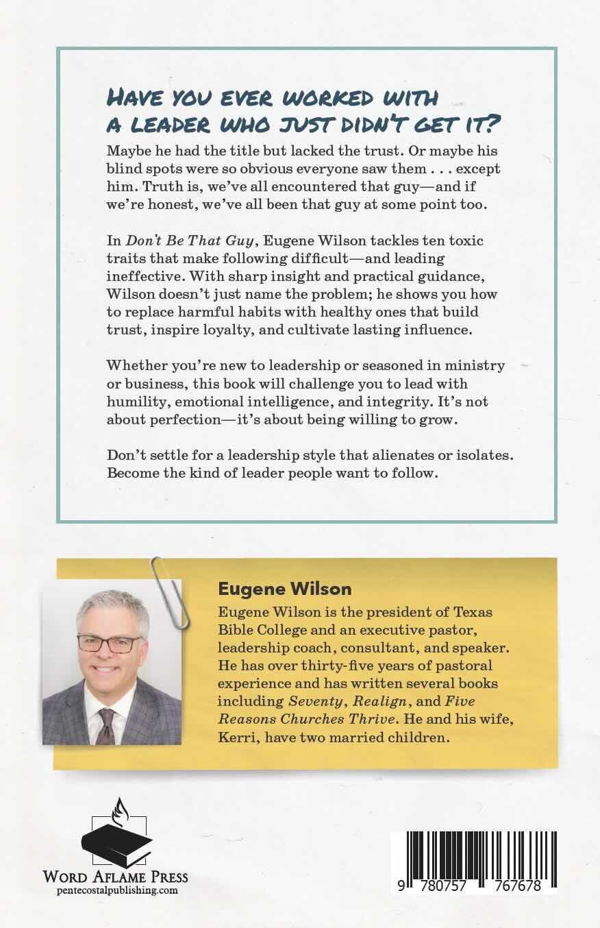 In Don't Be That Guy, Eugene Wilson tackles ten toxic traits that make following difficult—and leading ineffective. With sharp insight and practical guidance, Wilson doesn’t just name the problem; he shows you how to replace harmful habits with healthy ones that build trust, inspire loyalty, and cultivate lasting influence.